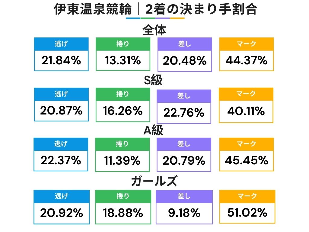 2着には「マーク」45.5%が突出しており、番手選手の位置取りと脚力が結果に直結していることがわかります。
