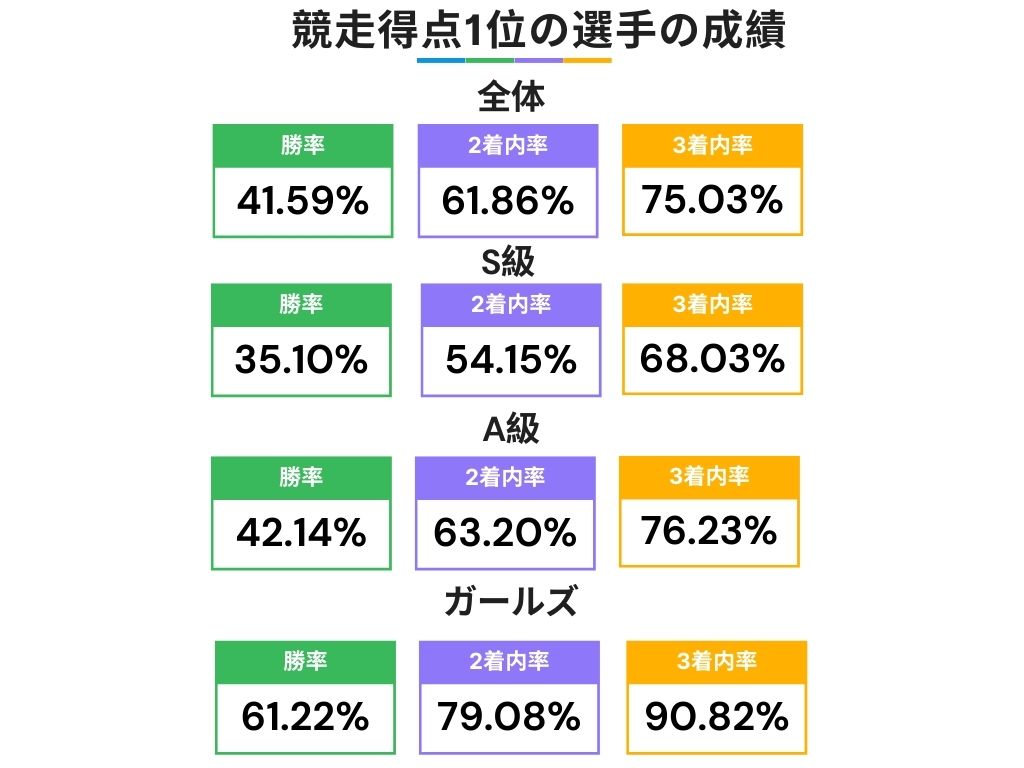 ガールズ戦の得点1位選手は、他クラスと比較しても勝率が高く、さらに連対率でも突出しています。展開を問わず捲り・逃げで勝ち切るケースが多く、力量差が如実に表れる舞台といえます。