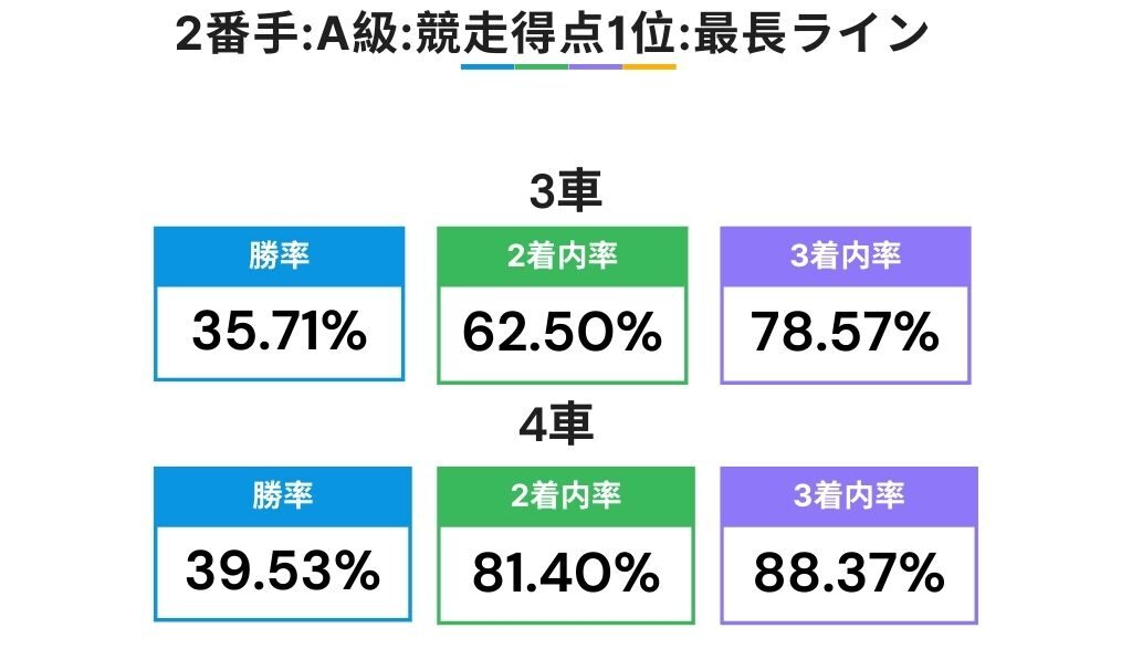A級、競走得点1位、最長ライン、3車ラインの2番手の条件が重なった時の成績