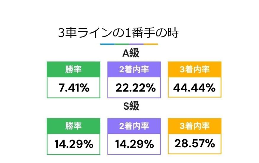 3車ライン1番手では、A級S級とも勝率が悪く、特にA級では7.4%と2車ライン先頭の時に比べ大きく下がります。