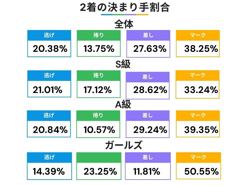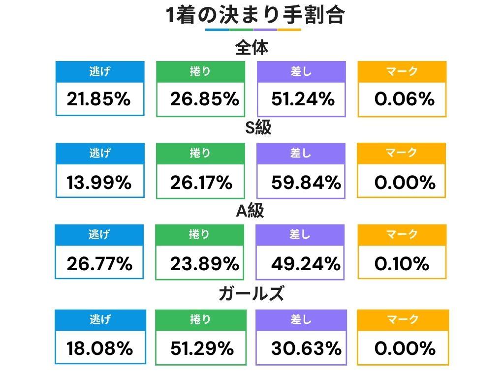 • (S級/A級)は差しが基本: 特にS級は約6割が差し決着。逃げての勝利は倍近い差がある。
